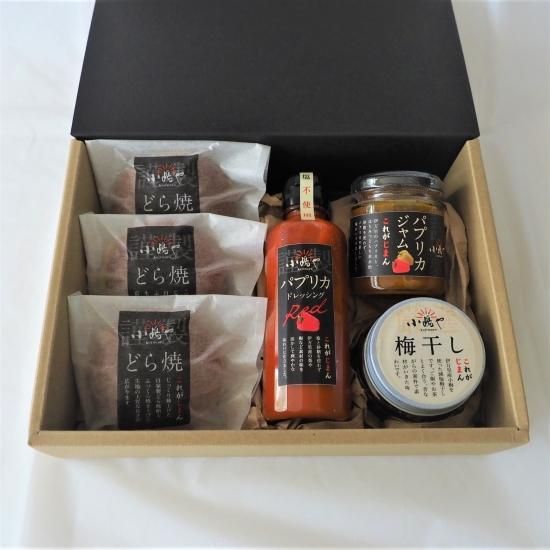 【保存方法】 | ・賞味期限はそれぞれ未開封の場合に限ります。 ・どら焼は直射日光を避け、涼しい場所で保存して下さい。 ・パプリカドレッシング、パプリカジャム、梅干しは直射日光を避けて保存してください。 ・パプリカドレッシング、パプリカジャム、梅干しは開封後は冷蔵庫に入れ、お早めにお召し上がりください。 |