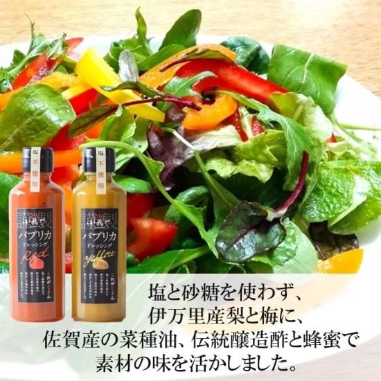 『赤パプリカドレッシング』・・・佐賀県伊万里産の赤パプリカを使って、爽やかな酸味の味に仕上げました。伊万里産梨、南高梅を加えることで、甘みがじわっと後から追いかけてくる味わい深さ。サラダにかけるだけでなく、野菜炒め、肉料理やパスタにコクを出すソースのようにして “ちょい足し” して美味しくいただけます。