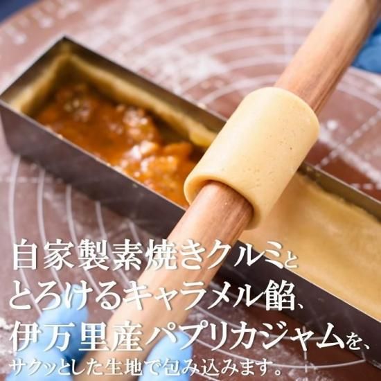 そんな絶品のくるみ入りキャラメル餡とパプリカジャムを、小麦粉の荒さや生地の厚さ、焼時間にこだわり抜いた、サクッとしたタルト生地に包み込みます。形状は片手で食べやすいスティック状でつまみやすく、おやつにピッタリ。